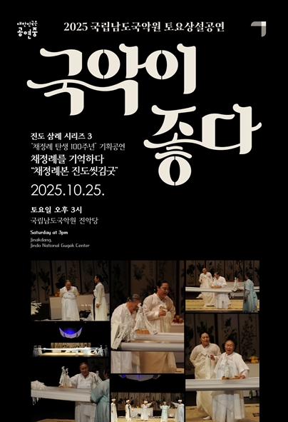 This performance honors the “Jindo Samrye,” three master musicians from Jindo, who were Jo Gongrye, Chae Jeongrye, and Kim Daerye. Marking the 100th anniversary of ssitgim-gut master Chae Jeongrye’s birth, her disciple Chae Sujeong joins the National Gugak Center for Namdo’s ensemble on stage. The program reflects on Chae Jeongrye’s life and the musical resonance she left behind, defined not by grandeur but by sincerity.