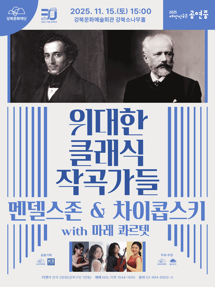 강북문화재단과 NCM Klassik이 공동 기획한 무대에서, 멘델스존과 차이콥스키의 대표 현악사중주가 마레 콰르텟의 정교하고 깊이 있는 해석으로 펼쳐진다. 프로그램은 1부 〈멘델스존: 현악사중주 제6번 F단조 Op.80〉, 2부 〈차이콥스키: 현악사중주 제1번 D장조 Op.11〉로 구성된다. 작곡가의 천재성과 음악적 깊이는 네 연주자의 풍성한 음향과 정교한 앙상블을 통해 고급스러운 감동으로 전해진다.