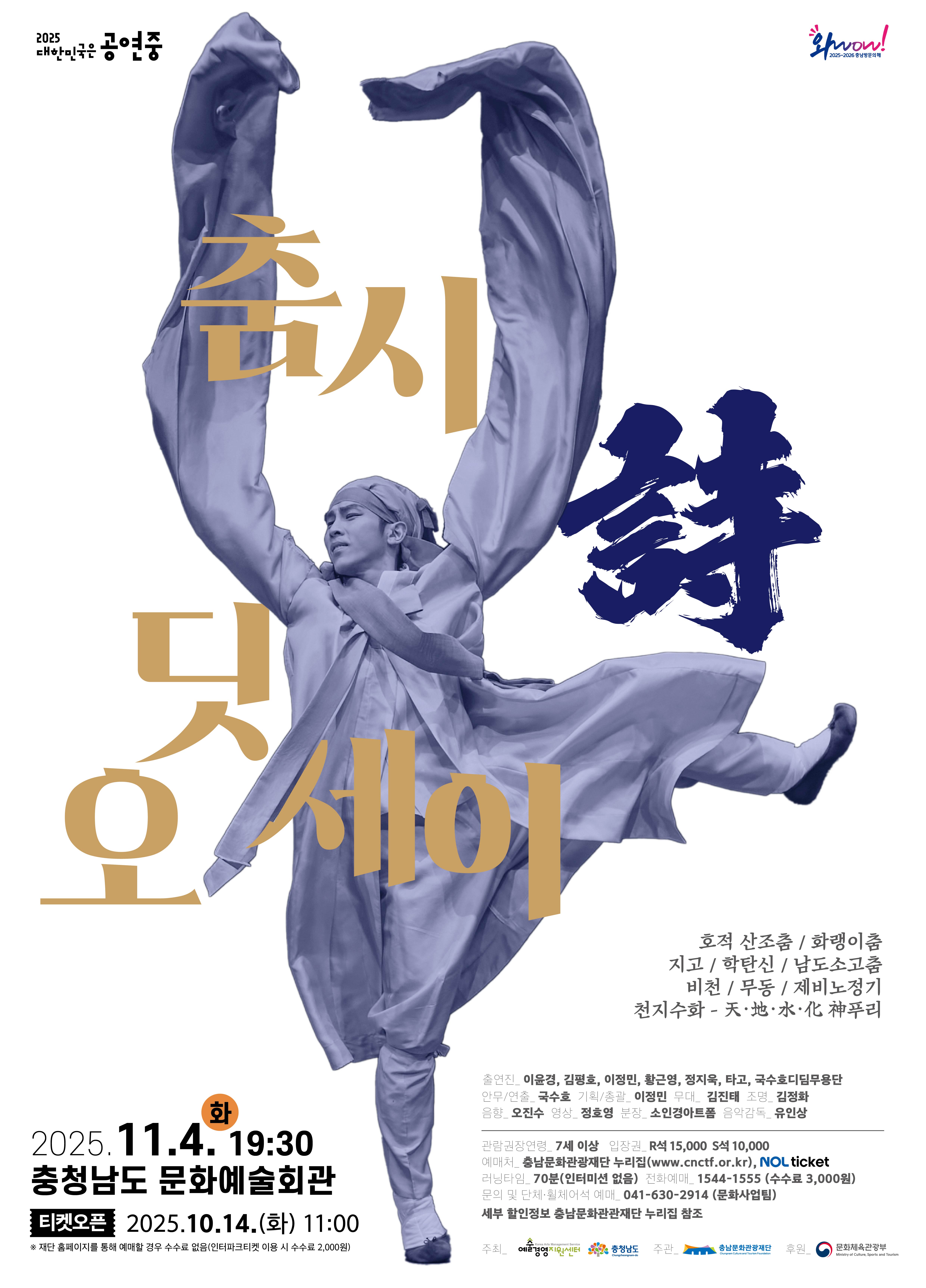 <춤시 오딧세이>는 전통 연희와 한국 신화를 현대적으로 풀어낸 6악장 무대다. 갈등과 화해, 삶과 죽음을 아우르며 웅장한 서사와 시적 움직임을 선보인다. 춤과 시, 음악과 시각적 연출이 어우러져 한국 춤의 예술적 가능성을 확장한다.