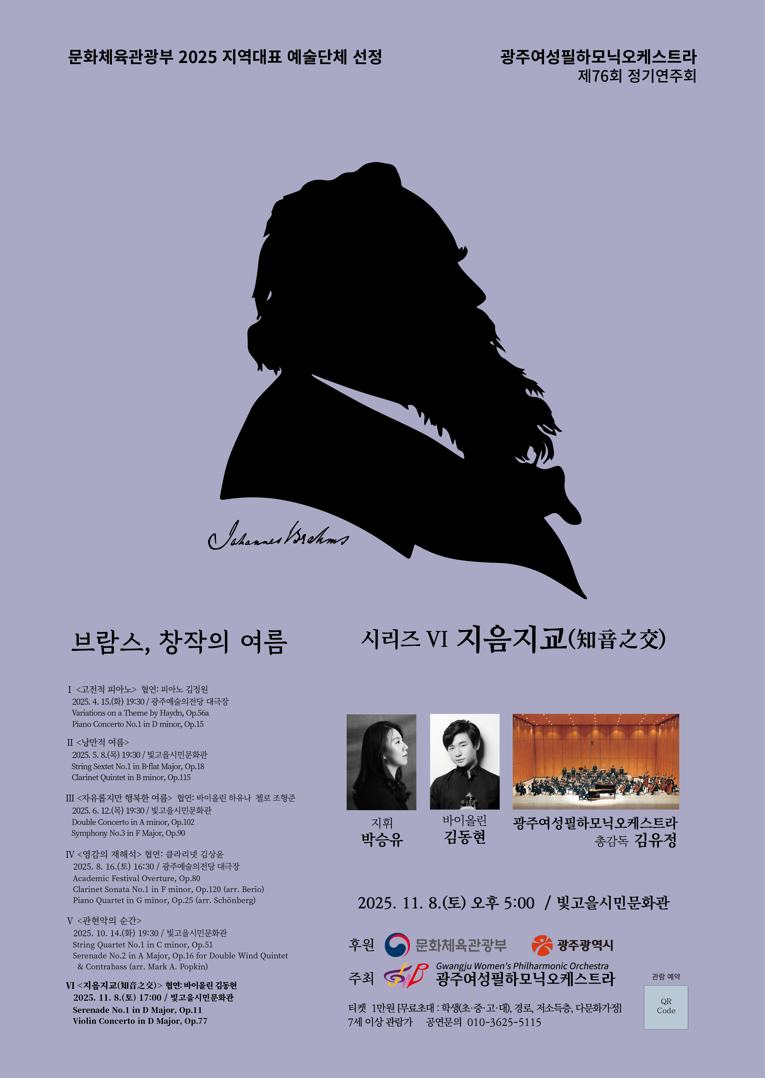 문화체육관광부 2025 지역대표 예술단체로 선정되어 독일 작곡가 브람스가 주로 여름에 유럽의 아름다운 도시에서 작곡한 명곡들을 시리즈 6개의 공연 중 시리즈 6 <지음지교(知音之交)>를 바이올린 김동현의 협연으로 공연한다.