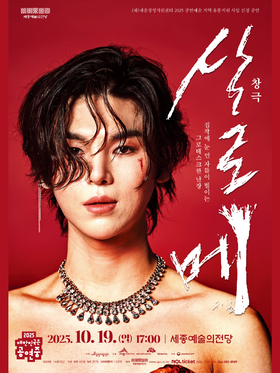 오스카 와일드의 희곡 〈살로메〉를 창극으로 각색한 작품. 살로메 공주와 헤로디아 왕비 역을 남성 배우가 맡아 성역할의 고정관념을 벗고 인물의 본질에 집중한다. 사랑과 욕망, 집착이 빚어낸 하룻밤의 비극은 결국 파국으로 치닫고, 허망하게 무너지는 인물들의 절규는 한이 서린 우리 소리와 만나 더욱 처절하고 극적으로 울려 퍼진다.